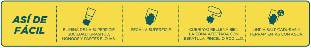 Limpiar la superficie para eliminar suciedad, grasitud, hongos y algas (con solución de agua lavandina), polvillo y restos de pintura floja y descascarada. No dejar restos de productos de limpieza. Por último secar bien la superficie.